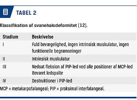 Hos patienter med RA er prævalensen for boutonnière- og svanehalsdeformitet henholdsvis ca. 34% og ca. 14% [5].