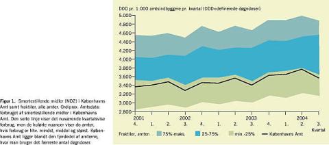 En god lægemiddelstatistik er grundlaget for at se, hvor der er potentielle problemer, og for at vurdere en interventionsindsats. IRF er placeret i Lægemiddelstyrelsen som gode naboer til den lægemiddeløkonomiske afdeling, hvor der udarbejdes statistikker og økonomiske forbrugsoversigter. IRF har endvidere i samarbejde med denne afdeling og baseret på en ide fra Storstrøms Amt opbygget en landsdækkende database - Ordiprax - der dels viser de enkelte lægers ordinationsmønster dels amternes forbrugstal, og hvad dette koster - alt sammenlignet med enten amtstal eller tal for hele landet (Figur 1 ). På denne måde bliver Ordiprax et brugbart værkstøj både for den enkelte læge og for de amtslige lægemiddelkonsulenter, der her har fået et internetbaseret kvartalsvis opdateret værktøj til for det enkelte lægemiddelstof at se på forbruget, priser og priser pr. forbrug. Der er nu mellem 1.000 og 2.000 hits pr. måned.