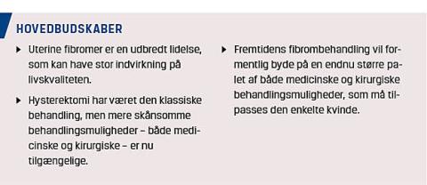 Uterine fibromer er hyppige og bør kun behandles ved symptomer. Den kirurgiske behandling er associeret med få komplikationer. Alternativt findes der medicinsk behandling med få bivirkninger. Den rette behandling bør tilrettelægges sammen med den enkelte kvinde i forhold til gener, alder, ønske om fremtidig fertilitet og eventuelle konkurrerende lidelser. Dette fordrer individualiseret rådgivning og patientinvolveret behandlingsvalg.