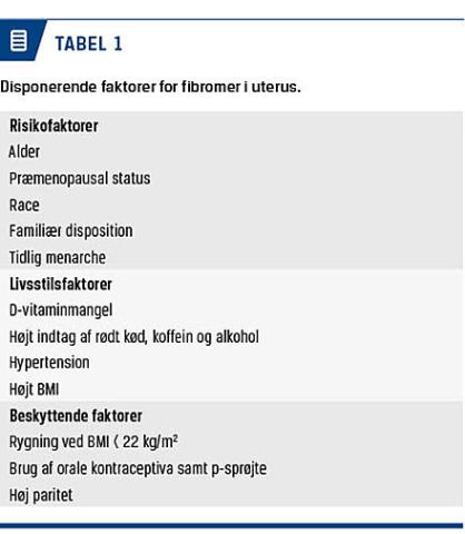 Da fibromer i uterus hyppigt er asymptomatiske, kendes den præcise prævalens ikke. I et amerikansk studie var prævalensen i 50-årsalderen 70% blandt kaukaside kvinder og over 80% blandt afroamerikanske kvinder [1]. I epidemiologiske studier har man fundet flere disponerende faktorer [2-4] (Tabel 1). Patogenesen er ikke fuldstændig kendt, men genetiske faktorer er sandsynlige pga. tendens til familiær ophobning og association med race. Desuden har man i genetiske studier identificeret genetiske variationer, der er associeret med fibromer [2]. Fibromer ses kun efter menarchen og regredierer oftest efter menopausen. Histologiske undersøgelser har vist større forekomst af receptorer for kønshormoner og vækstfaktorer i fibromer end i myometriet [2]. Disse forhold støtter antagelsen om kønshormonernes betydning for væksten af fibromer. De fleste af disse forhold kan i dag imidlertid ikke anvendes i den kliniske behandlingsstrategi, men indgår i forskningen for bedre forståelse af ætiologien og i udviklingen af nye behandlingsmetoder og måske på længere sigt præventive tiltag.