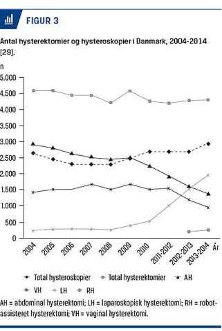 I Dansk Hysterektomidatabase har man opgjort, at over 80% af hysterektomierne i Danmark nu gennemføres ved minimalt invasiv kirurgi, dvs. vaginalt eller laparoskopisk (Figur 3). Samtidig er der set et fald i indlæggelsestider og i antallet af komplikationer [29].