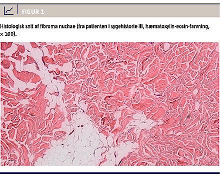 Excision af hudtumorer er et hyppigt indgreb. Kendskab til forskellige tumortyper er vigtig i differentialdiagnostisk øjemed. Fibroma nuchae (FN) er en benign, fibroblastær tumor, som involverer dermis og subkutis. På engelsk omtales den nuchal-type fibroma, men er også beskrevet under synonymerne collagenosis nuchae og nuchal fibroma. Vi beskriver tre tilfælde af FN.