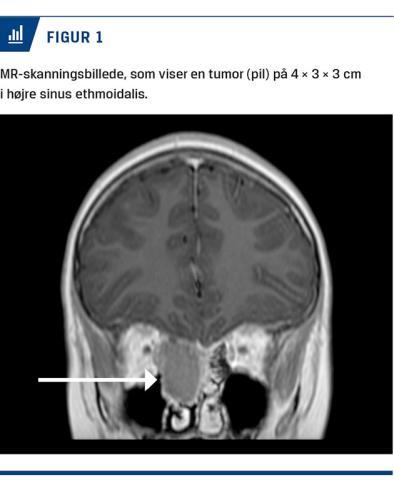 Før påbegyndelse af immunterapien blev han dog akut indlagt med hovedpine, nasalstenose, feber og smerter over højre kindben. På mistanke om purulent sinuitis blev der foretaget en MR-skanning, som viste en 4 × 3 × 3 cm stor tumor i højre sinus ethmoidalis (Figur 1). En histologisk undersøgelse viste FD. Den benigne tumor blev fjernet ved operation, hvilket medførte, at hovedpinen og smerterne over kindbenet forsvandt, samt at den nasale obstruktion blev lindret.