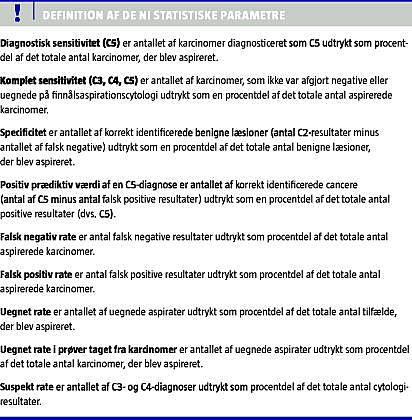 Alle FNAC blev sammenlignet med den endelige histologiske diagnose. I de tilfælde, hvor FNAC blev gentaget i udredningsforløbet, er beregningerne foretaget på prøven med den »mest maligne« diagnose. Da tallene kun inkluderer tal fra screeningsprogrammet, er det muligt at sammenligne FNAC med de europæiske anbefalinger. For at undersøge validiteten af FNAC har vi udregnet ni statistiske parametre, som afspejler kvaliteten af anvendelse af FNAC som led i tripeldiagnostikken. Parametrene er udregnet efter forskrifterne i European guidelines for quality assurance in breast cancer screening and diagnosis [6, se definition af de ni statistiske parametre].