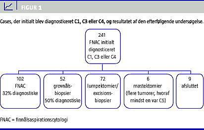 I alt 241 FNAC (Figur 1 ) i perioden 2001-2005 blev initialt diagnosticeret C1, C3 eller C4. Heraf fik 102 efterfølgende foretaget en ny FNAC, og 52 fik lavet en grovnålsbiopsi. Af de 102, som fik foretaget en ny FNAC, var denne diagnostisk hos knap 1/3 og fordelte sig med fem benigne (C2) og 27 maligne (C5) diagnoser.