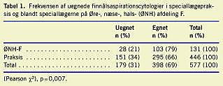 Der blev foretaget 715 FNAC, heraf blev 269 (38%) foretaget på ØNH-afdeling F og 446 (62%) af 14 otorhinolaryngologiske (ORL)-speciallæger i Fyns Amt. Lokalisationen af prøvetagningen var: hals 239 (33%), lymfeknude 217 (30%), spytkirtel 127 (18%), mundhule 40 (6%) og andet 92 (13%). Diagnoserne var: malign 392 (55%), benign 96 (13%) og uegnet til diagnostik 226 (32%). Der var 6% uegnede prøver, når indikationen var observation for malignitet, og 36% for de øvrige indikationer. Der var ingen forskel på antallet af uegnede prøver ved sammenligning af ØNH-afdelingen 77 ud af 269 (2 9%) og speciallægepraksis 151 ud af 446 (34%), p=0,14. Men der var signifikant forskel på speciallægepraksis 151 ud af 446 (34%) og speciallæger på afdeling F 28 ud af 103 (21%), p=0,007 (Pearson χ2 ) (Tabel 1 ). Der var ligeledes signifikant forskel på antallet af uegnede prøver ved sammenligning af speciallæger på afdeling F 28 ud af 132 (21%) og gruppen af læger under uddannelse 46 ud af 122 (38%) på ØNH-afdelingen, p=0,004 (Pearson χ2 ). Enogfirs gange fik en patient gentaget FNAC som følge af en primært uegnet prøve (36%). Af disse var 56 egnede (69%). Årsager til uegnethed var: tomt glas 35 (16%), perifert blod 77 (34%), for lidt til materiale til diagnose 46 (20%), teknisk ringe kvalitet 23 (10%), celler repræsenterer ikke læsionen 46 (20%).