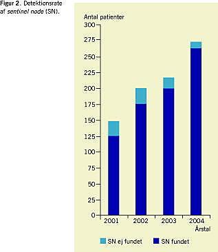 I hele perioden blev SN detekteret hos 764 patienter, hvilket giver en detektionsrate på 91%. I 2001 var detektionsraten 85%, i 2002 var raten 88%, i 2003 92% og i 2004 96% (Figur 2). Detektionsraten er signifikant forbedret år for år (χ2 = 20,10; sikkerhedsgrænser (df) = 3; p = 0,000). Vi har mediant fjernet to SN (spændvidde 1-6). Hos 254 (30%) patienter blev der fjernet en enkelt SN.