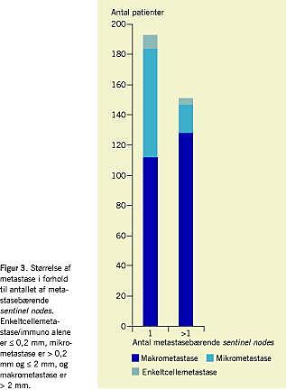 I alt 344 patienter (41%) havde metastaser til SN. Hos 193 patienter (56%) fandtes kun metastase til en SN, heraf var 81 (42%) mikrometastaser, og af disse var ni enten enkeltcellemetastaser eller alene fundet ved immunohistokemi. Hos 151 patienter fandtes der flere metastatiske lymfeknuder. Af disse havde de 23 (15%) kun en mikrometastase i SN (heraf fire enkeltcellemetastaser). Hos patienter med metastaser til en SN så man flere tilfælde med kun mikrometastaser end hos patienter med metastaser til flere SN (χ2 = 28,71; df = 1; p = 0,000) (Figur 3).