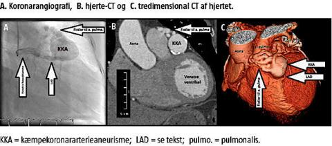 Ved KAG fandt man ingen betydende aterosklerose, men udtalt ektasi af venstre koronararteries hovedstamme og proksimale del af ramus interventricularis anterior (LAD). Ramus circumflexus (LCX) og højre koronararterie (RCA) var normale. Undersøgelsen var dog suboptimal, og den distale del af LAD kunne ikke fremstilles. Der blev derfor efterfølgende udført hjerte-CT, som ligeledes viste normale forhold i RCA og LCX, mens venstre koronararteries hovedstamme og den proksimale del af LAD var lang og ektatisk med en diameter på 8 mm. Ud for afgangen af første diagonal fandt man et anurisme med randforkalkning og en diameter på 35 mm. Fortil i anurismet sås et »ormegårdslignende« fistelsystem med kommunikation til a. pulmonalis. Den distale del af LAD efter aneurismet var uden stenoser.