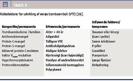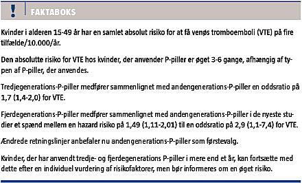 Den absolutte risiko for udvikling af VTE er hos 20-årige kvinder, der ikke benytter PP, 1-2 tilfælde pr. 10.000 kvinder pr. år [27]. Kvinder, der anvender PP, har tre gange øget risiko for VTE ved brug af andengenerations-PP [4], og i nyere studier har man fundet en seks gange øget risiko hos brugere af fjerdegenerations-PP sammenholdt med hos ikkebrugere [3, 17-20]. Til sammenligning er den absolutte risiko hos kvinder, der er i alderen 45-49 år og ikke benytter PP, øget med en faktor otte, og gravide har en 6-8 gange øget risiko [20, 27].