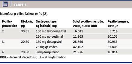 P-piller (PP) består af ethinylestradiol (EE) (fraset et præparat med østradiolvalerat) samt gestagen og inddeles i generationer på baggrund af gestagentypen [1] (Tabel 1. Anvendelse af PP medfører en øget risiko for venøs tromboembolisk sygdom (VTE), som er ca. 50% større i det første år efter påbegyndt indtag end i de efterfølgende år, hvor risikoen aftager og forbliver konstant, men ikke når et niveau som hos baggrundsbefolkningen [4]. Risikoen for VTE er bl.a. relateret til EE, som øger den hepatiske syntese af prohæmostatiske proteiner [5]. EE-dosis blev derfor reduceret fra > 50 mikrogram til ≤ 35 mikrogram, hvilket medførte en mindre reduktion i risikoen [6, 7].