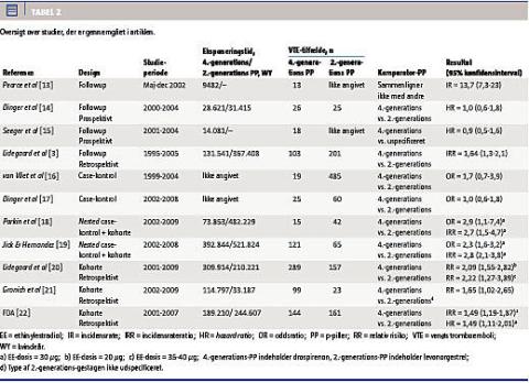 I syv studier har man fundet en øget risiko for VTE ved brug af fjerdegenerations-PP sammenlignet med andengenerations-PP [3, 16, 18-22]. I tre studier har man fundet samme risiko for alle PP [14, 15, 17]. I et studie sammenlignede man ikke med andre PP, men påpegede, som det første studie på området, en høj incidensrate for VTE ved anvendelse af fjerdegenerations-PP [13]. I Tabel 2 ses en oversigt over studierne. Flere af studierne har metodologiske problemer, der influerer på tolkningen af resultaterne.