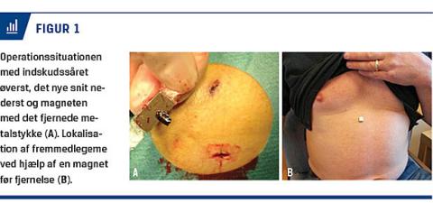 han gerne ville have det fjernet, blev han henvist til ambulant operation nogle dage senere. Hjemme lokaliserede han med en kraftig lille magnet metalstykket beliggende fem cm fra indskudssåret. Han medbragte magneten på operationsdagen, hvor man ved hjælp af den lokaliserede metalsplinten, lagde lokalbedøvelse og lavede et lille snit i huden. Magneten blev pakket sterilt ind, påsat huden over det lille snit og med den trak man efterfølgende et 9 × 5 × 2 mm stort metalstykke ud (Figur 1A).