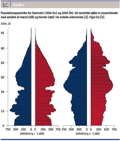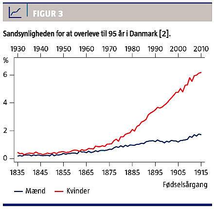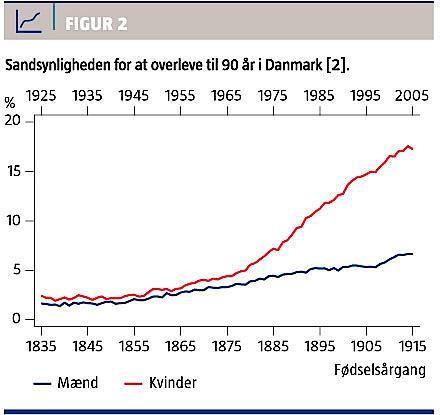 Ændringen i befolkningssammensætningen i Danmark har været meget markant siden 2. verdenskrig (Figur 1) [2]. Den vigtigste faktor i denne ændring er faldet i ældredødeligheden [4]. Således er mortalitetsraterne for 80-årige halveret over de seneste 50 år [3]. Dette i kombination med det store fald i børnedødeligheden før 2. verdenskrig har gjort, at sandsynligheden for at overleve til den tiende dekade er steget markant. Nu er 17% af de kvinder, som blev født for 90 år siden, stadig i live, i modsætning til blot 7% for 30 år siden. Som det fremgår af Figur 2 og Figur 3 [5-7], er andelen væsentlig mindre for mænd [8], hvor stigningen har været fra knap 5% til omkring 7%. En pragmatisk demografisk måde at definere en grænse for, hvornår man betegnes som »en ældre«, er den alder, hvor man i gennemsnit har ti leveår tilbage. Hvis denne definition anvendes, ville en ældre kvindelig patient i 1980 være 76 år og i 2010 79 år, mens tallene for mænd ville være hhv. 71 år og 76 år [9].
