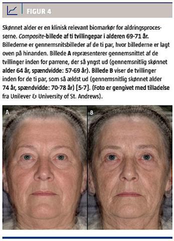 Måske noget overraskende har det vist sig, at skønnet alder (som er kendt fra hospitalsjournalernes udtryk »udseende svarende til alder«) er en klinisk anvendelig biomarkør [5-7]. Således viste et studie med 1.826 tvillinger, der var 70+ år og blev fulgt i de efterfølgende seks år, at skønnet alder prædikterede overlevelse bedre end kronologisk alder. Det viste sig således, at det var forbundet med større mortalitet at se et år ældre ud end at være et år ældre (Figur 4). Dette sammenholdt med den stærke association mellem selvrapporteret helbred og overlevelse [24] viser, at det på trods af den teknologiske udvikling fortsat er yderst informativt at vurdere ældre patienters almene tilstand og spørge, hvordan de har det.