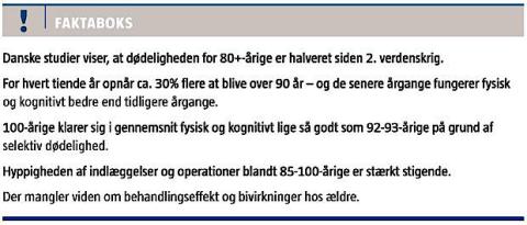 Inden for få årtier er der sket en markant ændring i behandlingen af de ældste i det danske sundhedsvæsen. Tidligere kunne man ofte uden større problemer afslutte en konsultation med en forsikring om, at »det er noget, der kommer med alderen« (underforstået, at det gør vi ikke noget ved). I dag udgives der bøger med titler som f.eks. »Afskaf alderdommen« [25], som kunne give én den tanke, at alderdommen var noget, vi kunne stemme om at afskaffe eller behandle os ud af. Vi er på kort tid gået fra at have klare aldersgrænser for mange undersøgelser og behandlinger til at have hjertestartere på plejehjem. Der er dog stadig uenighed om, hvorvidt vi behandler de ældste for lidt eller for meget. I en undersøgelse af hospitaliseringer for 1895- og 1905-årgangene i aldersforløbet 85-100 år var det ikke nogen overraskelse, at 1905-årgangen blev behandlet meget mere aktivt end 1895-årgangen i takt med fjernelse af aldersgrænserne. Flere blev indlagt, flere blev operativt behandlet, og de blev hurtigere udskrevet, også til eget hjem [26]. Men det var meget bemærkelsesværdigt, at ingen i 1895-årgangen fik en hoftealloplastik, da de var mellem 85 og 89 år. Men da de kom op i 90-94-årsalderen og selv efter, at de var fyldt 95 år, var de blandt dem, der fik en hoftealloplastik – faktisk fik 3% en hoftealloplastik i 95-99-årsalderen. Et positivt fund i dette arbejde var, at der på trods af flere indlæggelser med større operativ aktivitet ikke var nogen øget postoperativ mortalitet i den senere årgang, hvilket tyder på, at det var den generelle helbredstilstand og ikke den kronologiske alder, der var grundlaget for operationsindikationen [26]. Udviklingen i operationsteknikker og anæstesi har uden tvivl også spillet en rolle, men fjernelsen af »alderisme« er en afgørende faktor. The Royal College of Surgeons of England har anbefalet, at man laver en samlet vurdering af operationsrisikoen på baggrund af den biologiske (og ikke den kronologiske) alder, og at man samarbejder med geriatere om at vurdere komorbiditet [27].