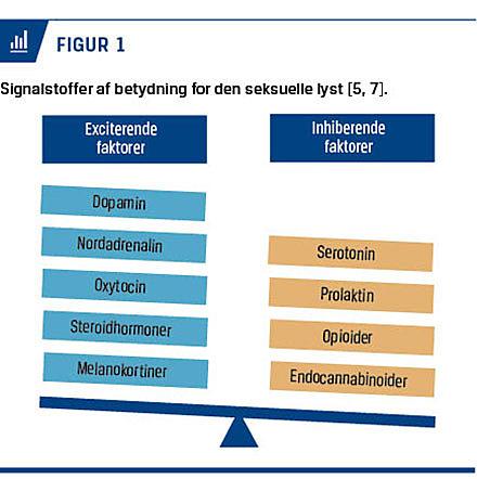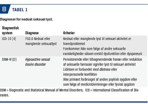 Seksuel lyst er således svær at definere, men kan beskrives som den subjektive oplevelse af villighed til at agere eller fantasere seksuelt [2]. Seksuallysten er for de fleste en integreret del af personligheden, og psykologiske, biologiske, kulturelle og interpersonelle faktorer er af betydning for en persons seksualitet og seksuelle lyst. Af samme grund kan nedsat seksuel lyst være forårsaget af en interaktion mellem bio-psyko-sociale faktorer, hvor den seksuelle lyst ændrer sig med alder, livsomstændigheder, parforhold, livsfaser samt somatisk og psykisk sygdom [3]. Nedsat eller manglende seksuel lyst er i sig selv ikke en sygdom, men defineres som dysfunktionen hypoactive sexual desire disorder (HSDD), hvis den ledsages af, at kvinden er generet af tilstanden (Tabel 1) [2, 4]. Trods vanskeligheden ved at kvantificere den subjektive oplevelse viser flere studier, at prævalensen af HSDD blandt kvinder er ca. 10% [2].
