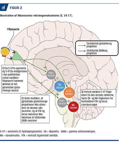 seksuelle oplevelser [21-23]. Disse effekter på seksuallysten er forenelige med flibanserins påvirkning af præfrontale 5-HT1A- og 5-HT2A-receptorer, der resulterer i en stigning i de excitatoriske neurotransmittere dopamin og noradrenalin samt et fald i den inhibitoriske neurotransmitter serotonin [6].