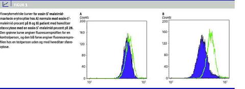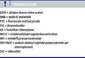 Hereditær sfærocytose (HS) er den hyppigst forekommende arvelige hæmolytiske anæmi i Nordeuropa. Sygdommen skyldes en defekt i et eller flere af de proteiner, der indgår i erytrocyttens cytoskelet. De mest almindelige proteindefekter hidrører spektrin, ankyrin, bånd 3 eller protein 4.2, hvoraf de to førstnævnte er de hyppigste, oftest som kombineret defekt [1]. Defekter i cytoskelettets proteiner medfører en dårlig forankring af cellemembranen. Det kliniske billede er relateret til hæmolyseaktiviteten med varierende grader af anæmi, icterus, galdesten og splenomegali, og fænotypen varierer fra meget mild sygdom til svær tranfusionskrævende hæmolyse. I de fleste tilfælde arves tilstanden dominant, men recessive tilfælde ses. Biokemisk ses en Coombs-negativ hæmolytisk anæmi med karakteristisk forhøjet middelcellehæmoglobinkoncentration (MCHC) og i perifert blodudstryg findes mikrosfærocytter, som dannes grundet tab af membranmateriale. Diagnosen HS stilles dog først og fremmest ved påvisning af erytrocytternes nedsatte osmotiske resistens, som er en manuel, tidskrævende undersøgelse med begrænset specificitet og sensitivitet [2]. Desuden kræves en vis laboratoriemæssig rutine for at sikre validiteten af undersøgelsen. Alternative undersøgelser som ektacytometerundersøgelse og sodium dodecyl sulfate-polyacrylamide gel electrophoresis (SDS-PAGE) har høj sensitivitet, men er kun tilgængelige få steder [2, 3]. Nyere undersøgelser peger på, at man ved flowcytometrisk undersøgelse ved eosin-5'-maleimid (EMA)-binding til bånd 3 i erytrocytmembranen kan påvise HS med både høj sensitivitet og specificitet [4-7]. Vi har evalueret den flowcytometriske metode ved at sammenligne fluorescensintensiteten hos patienter med kendt HS og patienter med andre hæmolytiske tilstande.