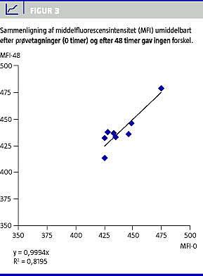 Reproducerbarheden af resultaterne afhænger af opbevaring af patientprøver, holdbarhed af farvestoffet, EMA og inkubationstid. Holdbarhedsforsøg viste, at prøver, der blev opbevaret ved stuetemperatur, gav uændret fluorescens inden for de første 48 timer. En sammenligning af den fundne fluorescensintensitet hos otte personer umiddelbart efter prøvetagning og efter opbevaring af prøven ved stuetemperatur i 48 timer viste en korrelationskoefficient på 0,82 (Figur 3 ).