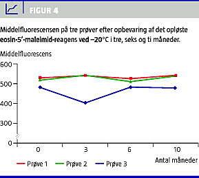 Analysevariationen i samme serie er undersøgt ved at gentage samme patientprøve ti gange. Variationskoefficienten på MFI var i dette forsøg på 3,8%. EMA-pulveret (eosin-5'-maleimid, BioChemika, Sigma Aldrich) blev opløst i fosfatbuffer (pH 7,3-7,4) til en koncentration på 0,5 mg/ml og fordelt i et passende volumen (afhængigt af forventet prøveseriestørrelse). Efter hver analyseserie blev resterende EMA kasseret. Holdbarheden af EMA-reagenset ved -20°C blev undersøgt ved, at der den samme dag udførtes bestemmelser på tre prøver med nyt reagens og henholdsvis tre, seks og ti måneder gammelt reagens. Der var meget lidt variation i resultaterne uafhængigt af opbevaringsperiodens længde (0-10 måneder) (Figur 4 ). Herefter blev reagens opbevaret ved -20°C med en holdbarhed på mindst seks måneder.