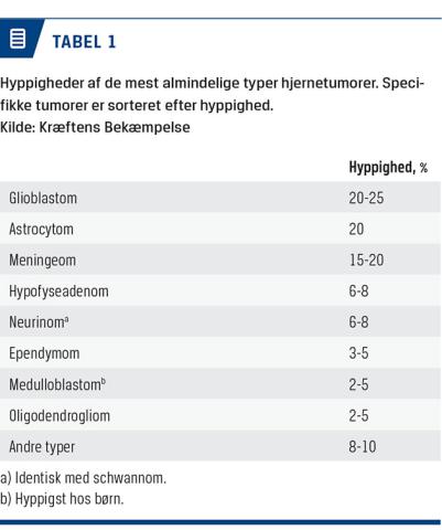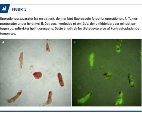 Intracerebrale tumorer bliver traditionelt opereret under almindeligt hvidt lys ved brug af operationsmikroskop. Gennem de seneste 10-20 år er neuronavigationsystemer blevet en uundværlig del af planlægningen og gennemførelsen af operationerne. Navigationssystemerne har forbedret kvaliteten af indgrebet og har medvirket til, at kraniotomierne bliver mindre. Det er dog til stadighed en udfordring at skelne patologisk væv fra intakt hjernevæv under operationen. Dette gælder især for de mere diffust infiltrerende tumorer, hvoraf glioblastomer er den hyppigste type [1] (Tabel 1). For at forbedre identifikationen af tumorvæv har man gennem de seneste år anvendt 5-aminolevolinsyre (5-ALA) som tidligere beskrevet i Ugeskrift for Læger [2], med forbedret resektion og overlevelse til følge [3].