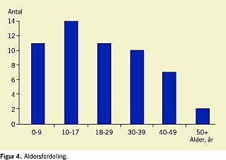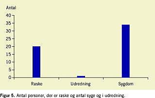 Ad Figur 6. Fem, alle med somalisk baggrund, blev fundet positive for tuberkulose forstået på den måde, at to af hinanden uafhængige personer havde lungetuberkulose og blev sat i behandling, to familiemedlemmer med stærkt positiv tuberkulintest blev sat i behandling. En 17-årig pige, hos hvem der røntgenologisk var stærk mistanke om lungetuberkulose, forsvandt fra familien, før hun blev udredt.
