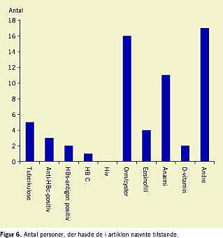 Vi er opmærksomme på, at nogle af patienterne, i alt 16, der er undersøgt alene i Røde Kors-regi, ikke har fået foretaget blodprøver og røntgenundersøgelse af thorax. Det er selvfølgelig en svaghed ved undersøgelsen, da vi ved fuldt screeningprogram, hvor også disse patienter var inkluderet, måske ville have fundet en endnu højere sygdomsfrekvens. Imidlertid er sygdomme fundet i undersøgelsesperioden medtaget, så vi forventer, at det drejer sig om et begrænset antal, men der er alt andet lige tale om minimumstal.