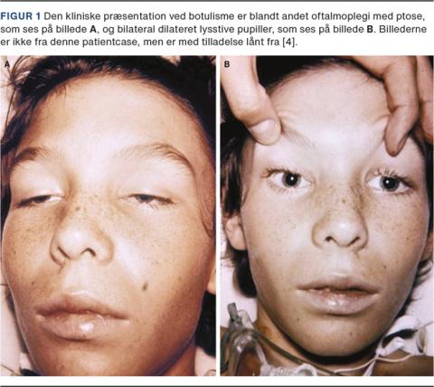 Mistanke om botulisme rejses på symptomatologien med tale- og synkebesvær samt objektive fund som dysartri og mydriasis med ophævet lysreaktion (Figur 1). Almindelige blodprøver, billeddiagnostiske undersøgelser og undersøgelse af cerebrospinalvæske er ofte upåfaldende. Andre – og hyppigere forekommende – differentialdiagnoser er Guillian-Barrés syndrom og myastenia gravis [1].