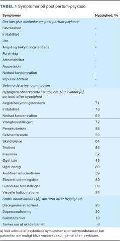 I et prospektivt studie fra 2015 [5] fulgte man 130 kvinder med det formål at beskrive fænotypiske karakteristika ved PPP. De hyppigst observerede symptomer (Tabel 1) var angst, irritabilitet, nedsat opmærksomhed og vrangforestillinger. Vrangforestillingerne var ofte persekutoriske eller selvhenførende, men kunne også omhandle det nyfødte barn. Hallucinationerne var hyppigst auditive eller visuelle. Disorganiseret adfærd og depersonalisering var sjældnere end hidtil antaget. Selvmordstanker og tanker om at skade barnet forekom sjældnere i dette studie end rapporteret i andre studier [8, 22].