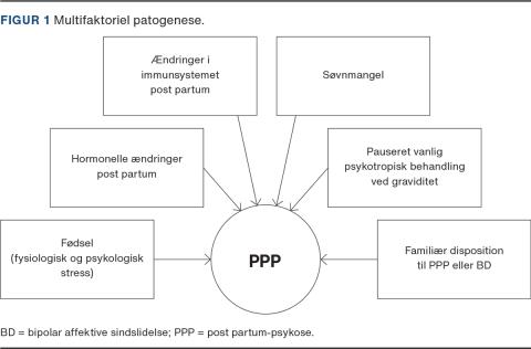 PPP har til forskel fra mange andre psykiske lidelser en velkendt biologisk trigger, nemlig fødslen. Herudover er patogenesen multifaktoriel (Figur 1), et samspil mellem biologiske faktorer og psykosociale stressorer. Selve fødslen er en fysiologisk og psykologisk stresstilstand. Søvnmangel, som er en kendt trigger for manisk episode, er også en vigtig faktor [1, 20], derved kan et langvarigt og kompliceret fødselsforløb muligvis øge risikoen. En del kvinder har en kort periode med emotionel labilitet efter fødslen, »maternity blues«, som normalt vil forsvinde af sig selv [21]. Det antages, at underliggende biologiske mekanismer bidrager væsentligt, da tilstanden debuterer tæt på fødslen, og prævalensen er relativt stabil også globalt [7]. De fremherskende teorier er, at hormonelle ændringer og dysregulering af immunsystemet post partum spiller en rolle [1, 4, 6, 20].