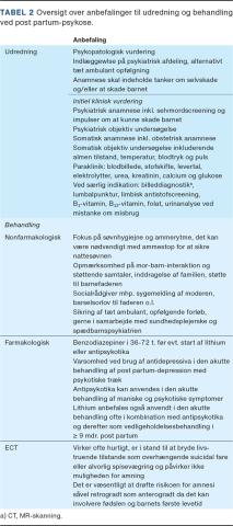 Tilstanden kan udvikle sig hurtigt og alvorligt, hvorfor indlæggelse, udredning og start af farmakologisk behandling oftest er anbefalet (Tabel 2). Ideelt indlægges moderen sammen med barnet på en psykiatrisk mor-barn-afdeling med tæt observation, hvis dette er forsvarligt i forhold til moderens tilstand. I Danmark er denne type indlæggelse ofte ikke en mulighed pga. manglende ressourcer. Det er vigtigt, at der ved indlæggelse på en voksenpsykiatrisk afdeling sikres en tæt kontakt mellem mor og barn. Indlæggelsen er ofte længerevarende, 1-3 måneder, og krævende for patienten og familien.