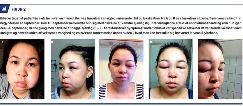 Patienten havde under forløbet hverken haft feber, forhøjet C-reaktivt proteinniveau eller andre sygdomstegn. Tilstanden blev set an i en måneds tid, indtil kvinden henvendte sig igen, denne gang med hævelse og ømhed af venstre kind (Figur 2A + B). På mistanke om infektion blev hun sat i penicillinbehandling, og hævelsen forsvandt dagen efter. To uger senere fik hun imidlertid igen en øm hævelse, denne gang af venstre øjenlåg (Figur 2C) og blev uden effekt sat i dicillinbehand-