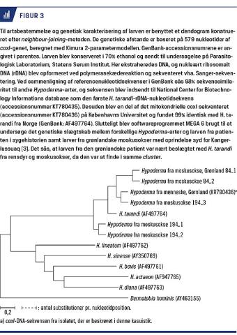 Skønt fravær af eksposition for rensdyr blev der rejst mistanke om infestation med H. tarandi. Patienten havde ikke haft andre symptomer fra øjnene, og ved en oftalmoskopi blev der fundet normale forhold, hvorfor der ikke opstod mistanke om oftalmomyiasis. Ved den objektive undersøgelse fandt man ingen æg i bulen i hovedbunden, men en bule af størrelse som et myggestik (0,5 × 0,5 cm) kunne identificeres. Ud fra klinisk mistanke blev der ordineret ivermectin 0,2 mg/kg som engangsdosis. Hun responderede godt på denne behandling og havde ingen efterfølgende gener eller tegn på vedvarende infektion. Larven blev artsbestemt og karakteriseret genetisk (Figur 3).