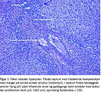 Fokal nodulær hyperplasi (FNH) blev beskrevet første gang i 1954 [1] og defineres i dag som en godartet fokal læsion i leveren. Læsionen består af hyperplastisk levervæv arrangeret i noduli adskilt af fibrøse septa, der kan danne et stellat ar [2]. FNH ses i alle leversegmenter, solitært eller multipel og med størrelser op til 20 cm i diameter [3]. For nylig har Makhlouf på baggrund af en gennemgang af 100 biopsier med FNH revideret de diagnostiske kriterier for nålebiopsier [4]. Karakteristisk findes der tykvæggede kar uden tilhørende galdegange eller vener, duktulær proliferation og tegn på kronisk galdestase blandt andet i form af ophobning af kobberassocieret protein (ses i orceinfarvning).