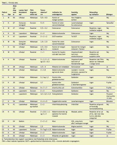 Elleve patienter var i et udredningsforløb for nuværende eller tidligere malign sygdom. Otte patienter blev udredt for abdominale/gynækologiske sygdomme, som senere viste sig at være benigne. Fire patienter blev undersøgt alene på grund af abdominalgener, såsom ukarakteristiske smerter og kvalme. En afdød patient fik først konstateret FNH ved sektion. Af samtlige 24 patienter havde 11 (46%) gastrointestinale symptomer. I otte tilfælde kunne symptomerne relateres til patientens i øvrigt kendte sygdomme.