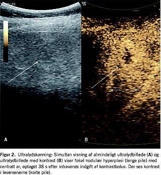 Fokale processer i leveren kan karakteriseres dynamisk med CT, MR- eller ultralydskanninger efter intravenøs administration af en bolus af et relevant kontrastmiddel. Dermed opnås højere specificitet og sensitivitet [17]. Kontrastopladningen i FNH kan vise den typiske arterielle forsyning og det centrale ar. Påvises FNH ved to uafhængige billeddiagnostiske undersøgelser, vil biopsi kunne udelades. Biopsi anbefales dog fortsat ved atypisk billeddiagnostik eller ved klinisk mistanke om malignitet. I dette studie var kun to MR-undersøgelser diagnostiske af alle de billeddiagnostiske undersøgelser, og i begge tilfælde valgte man alligevel at bioptere.