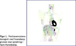 En cerebral computertomografi (CT) viste normale forhold. Patienten blev henvist til tumorudredning på Rigshospitalet. Ved en positronemissionstomografi (PET) med fluorodexotyglukose blev der påvist øget aktivitet i højre thyroidealap (Figur 1 ).