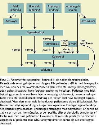 Med ca. 3.700 tilfælde pr. år er kolorektal cancer (CRC) den tredjehyppigste cancerform i Danmark [1], og femårsoverlevelsen er ca. 50% [2]. En praktiserende læge i Danmark vil årligt se en ny patient med CRC. Bl.a. fordi Danmark indtil for få år siden havde den dårligste CRC-overlevelse i Europa [3], blev de nationale retningslinjer (NR) for udredning af symptomer, der er forenelige med CRC, opdateret i 2002 [4]. Målet med retningslinjerne er at minimere tiden fra første lægekontakt til behandling.