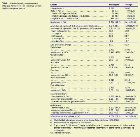 For hvert barn anvendtes den gennemsnitlige eksamens-karakter og den gennemsnitlige årskarakter. Desuden så vi separat på matematik- og danskkarakteren. Eksamenskarakterer forelå for årene 2002-2004 for fødselsårgangene 1986-1988. Vores undersøgelse omfatter samtlige tvillinger og en 5% stikprøve af enkeltfødte, der er født i Danmark i 1986-1988.