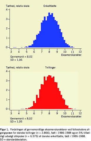Gennemsnitsprøvekaraktererne ved folkeskolens afgangsprøve i 9. klasse var normalfordelt med næsten identiske gennemsnit og standardafvigelser hos tvillinger og enkeltfødte (8,02 mod 8,02 og 1,05 mod 1,06) på trods af, at tvillingerne i gennemsnit vejede næsten et kilo mindre end enkeltfødte ved fødslen (Figur 1 ). Resultaterne af multivariate analyser bekræftede, at tvillingers skoleresultater nøje svarede til enkeltfødtes, også når der blev kontrolleret for køn, alder på prøvetidspunktet, fødselsvægt, gestationsalder samt forældrenes alder og uddannelse. Også for såvel årskaraktererne som prøveresultaterne i de enkelte fag sås et lignende mønster. Det vil sige, at der ikke blev fundet forskelle på tvillinger og enkeltfødte, bortset fra at tvillinger klarede sig en anelse bedre i matematik end enkeltfødte (forskel 0,13, 95% KI: 0,03-0,23).