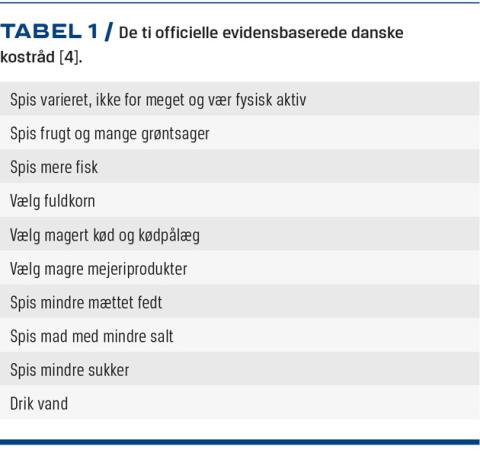 Ved mad og måltider forstås alle føde- og drikkevarer, der indgår i en samlet kost over en længere periode. Sunde mad- og måltidsvaner defineres i forhold til de ti officielle evidensbaserede danske kostråd fra 2013 (Tabel 1) [4], der er udarbejdet for at fremme sundhed, reducere risiko for kostrelaterede sygdomme og fremme fysisk aktivitet.