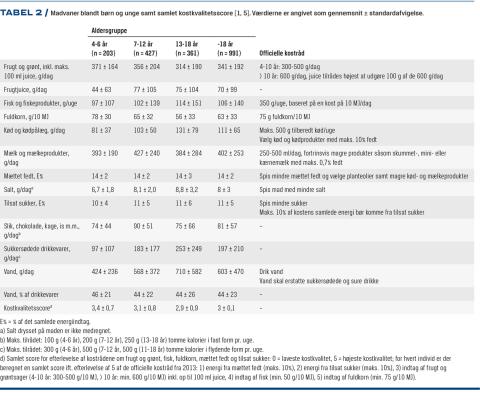 Kostkvalitetsscoren er beregnet som en samlet score fra 0 til 5 i forhold til efterlevelse af fem af de officielle kostråd fra 2013: 1) energi fra mættet fedt (maks. 10%), 2) energi fra tilsat sukker (maks. 10%), 3) indtag af frugt og grøntsager (4-10 år: 300-500 g/10 MJ; > 10 år: min. 600 g/10 MJ) inkl. op til 100 ml juice, 4) indtag af fisk (min. 50 g/10 MJ) og 5) indtag af fuldkorn (min. 75 g/10 MJ). 0 angiver den laveste kostkvalitet, hvor efterlevelsen er længst fra kostrådene, og 5 angiver den højeste kostkvalitet og dermed efterlevelse af alle kostrådene. De 4-6-årige havde den højeste kostkvalitet (3,4 ± 0,7), mens de 13-18-årige havde den laveste kostkvalitet (2,9 ± 0,9) [1, 5].