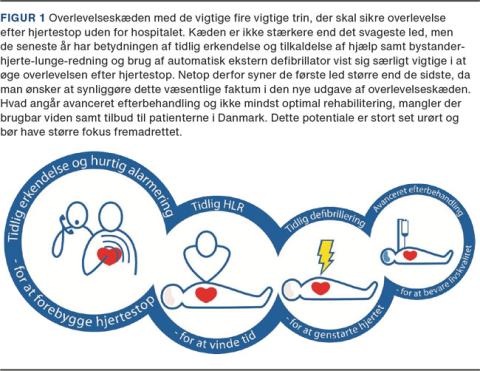 Hvert år får omkring 5.000 personer (incidens 85/100.000 indbyggere) pludseligt uventet hjertestop uden for hospital (out-of-hospital cardiac arrest (OHCA)) i Danmark [1]. På bare 20 år er det lykkedes at næsten firdoble overlevelsen i Danmark fra 3-4% i 2001 til 14% i 2020 [1]. I 1991 introducerede American Heart Association konceptet »chain of survival« (overlevelseskæden) for at bedre overlevelsen efter OHCA [2]. Overlevelseskæden fokuserer på: 1) at sikre tidlig erkendelse af OHCA og tilkaldelse af professionel hjælp, 2) tidlig opstart af basal hjerte-lunge-redning (HLR), 3) tidlig defibrillering med automatisk ekstern defibrillator (AED) og 4) avanceret efterbehandling (Figur 1). Overlevelseskæden er nu en integreret del af både internationale og danske rekommandationer for hjertestopbehandling [3]. Formålet med denne artikel er at give et overblik over de initiativer, der er iværksat for at styrke de tre første led i overlevelseskæden.