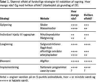 Inden for tobaksområdet - som er den moderne forebyggelses frontområde - er specielt amerikanerne efterhånden nået så langt, at det er muligt på et videnskabeligt grundlag at vurdere potentialet i forskellige forebyggelsesstrategier [9]. Af Tabel 1 ses for eksempel, at skatter og restriktioner er mere effektive end individrettede indsatser med hjælp til rygeophør.