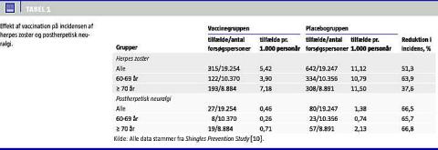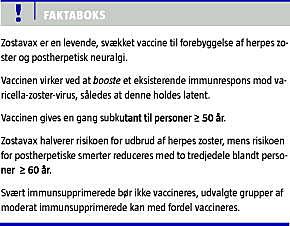 Herpes zoster (HZ) og postherpetisk neuralgi (PHN) er hyppigt forekommende sygdomme hos ældre og immunsupprimerede. Der findes en vaccine til forebyggelse af HZ og PHN, som virker ved at booste et eksisterende immunrespons, således at den allerede etablerede varicella-zoster-virus-infektion holdes latent. Vaccination halverer risikoen for udbrud af HZ, og risikoen for PHN reduceres med to tredjedele blandt personer på ≥ 60 år. Vaccinen er godkendt til personer i alderen ≥ 50 år. Den kliniske effekt af vaccinen er bedst undersøgt hos ≥ 60-årige. Der er ikke set alvorlige bivirkninger af vaccinen.