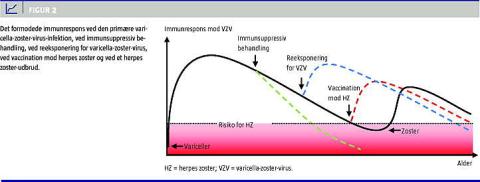 Formålet med traditionelle vacciner er at undgå infektion med det patogen, der vaccineres mod. Formålet med at give vaccine mod HZ er selvsagt ikke at undgå infektion med VZV, da praktisk taget alle, der vaccineres, vil have en kronisk VZV-infektion. HZ-vaccinen er den første vaccine, der virker ved at booste den allerede erhvervede cellulære immunitet over for VZV. Årsagen til, at der er behov for dette, er, at den cellulære immunitet aftager med alderen (Figur 2 ). Studier har vist, at udviklingen af HZ er inverst relateret til VZV-immunresponset. Det har dog ikke været muligt at definere en specifik grænse for immunresponset, over hvilken HZ ikke forekommer [9, 10].