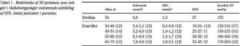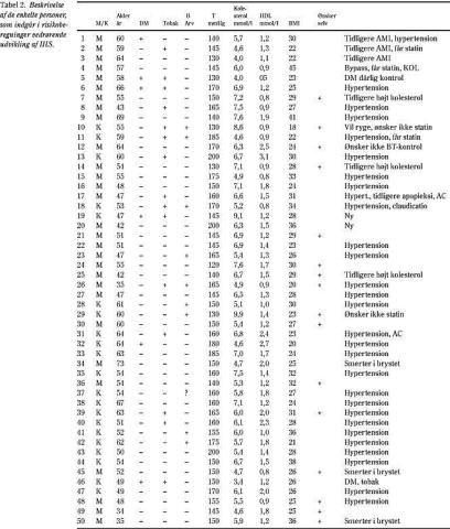 Beskrivelsen af de 50 personer, der indgik i undersøgelsen, fremgår af Tabel 1 . En nærmere beskrivelse af hele materialet fremgår af Tabel 2. I kolonnen DM angives +/- type 2-diabetes. Tobak angiver +/- rygning, Arv angiver +/- arvelig disposition til IHS, »Ønsker selv« angiver, om patienten selv har ønsket risikovurderingen.