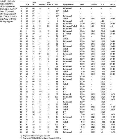 Resultater: I undersøgelsen indgik fire personer med manifest iskæmisk hjertesygdom. Efter DSAM's vejledning fandtes derudover otte personer med >20% risiko for udvikling af iskæmisk hjertesygdom. Efter DCS fandtes ti personer og med PRECARD tre personer med risiko >20%.