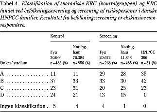 Af de fundne KRC blev 77% diagnosticeret i et lokalt stadie (Dukes' A og B). I Tabel 4 er Dukes'-stadiet ved diagnosetidspunktet for sporadisk KRC sammenlignet med KRC, der er fundet ved befolkningsscreening og ved screening i danske HNPCC-familier.